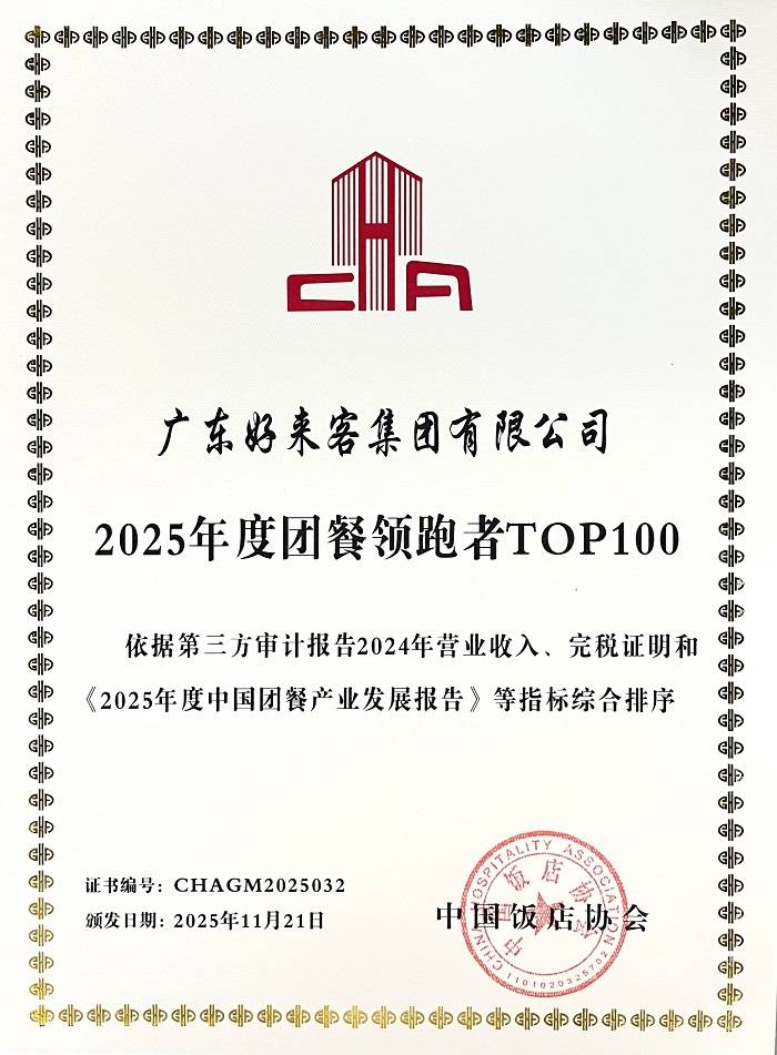 行稳致远,荣誉为证。自成立以来,好来客集团一直以质量为基、以诚信为本,凭仗全财产链结构、严苛的食安办理取杰出的办事能力,博得行业取市场的双沉承认,斩获沉磅殊荣无数。集团持续多年连任**中国团餐集团10强、中国餐饮企业百强**,上榜“团餐领跑者TOP100”,获评广东省高新手艺企业、广东省沉点农业龙头企业、广东省守合同沉信用企业、广东省食物平安办理十佳企业等数十项国度级、省级荣誉,斩获AA信用企业、广东好雇从等称号,成为佛山首家可自从认定职业技术品级的餐饮企业。